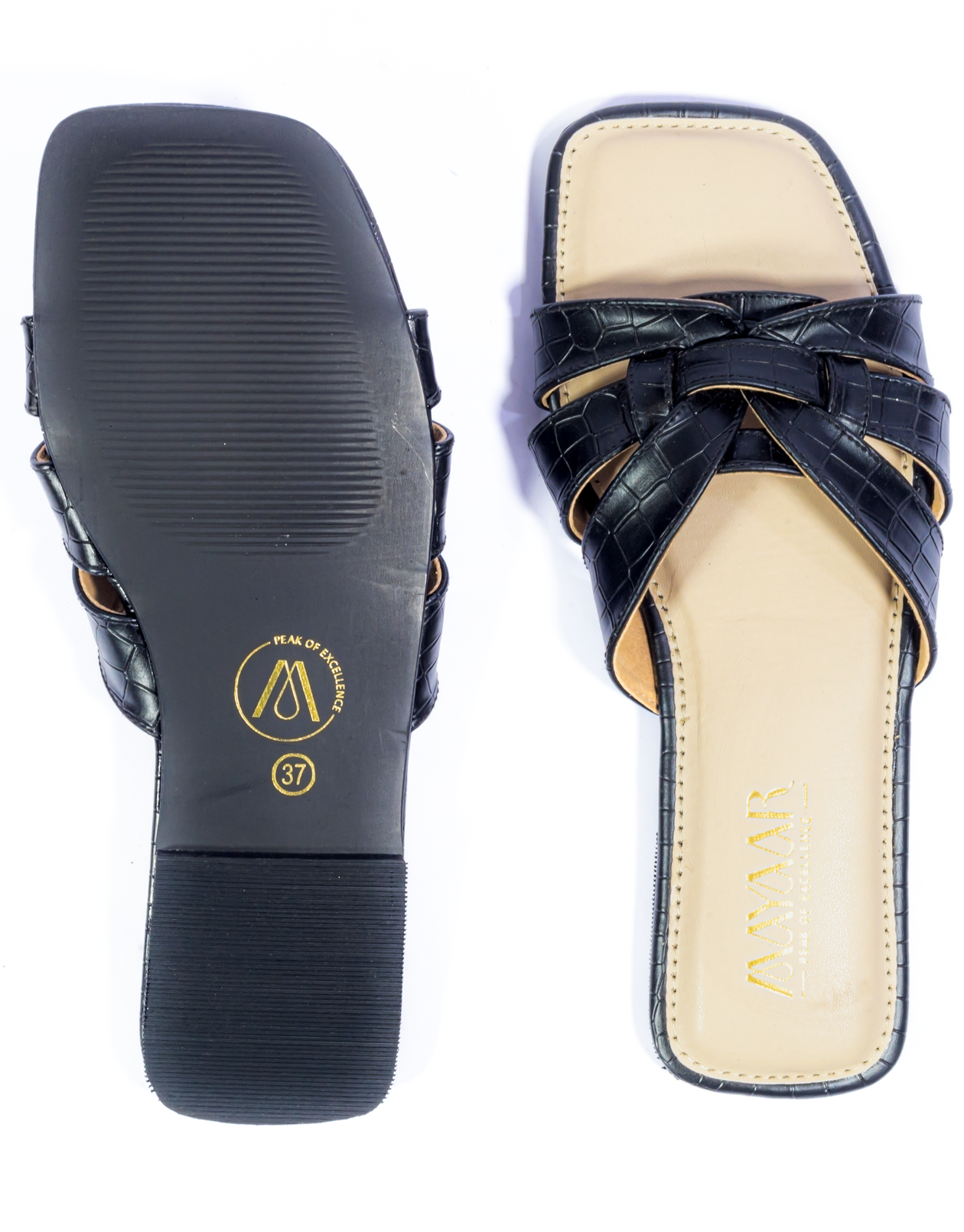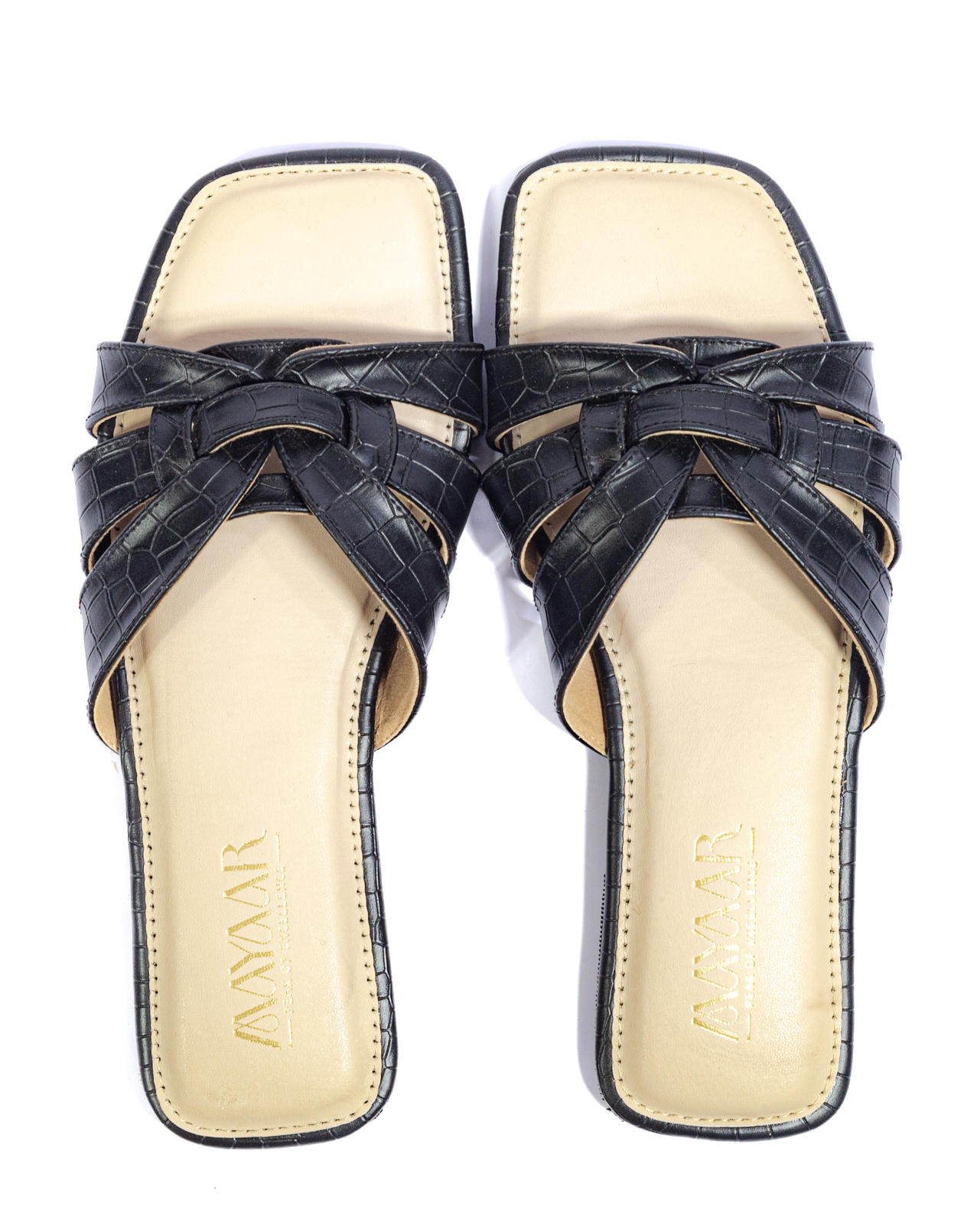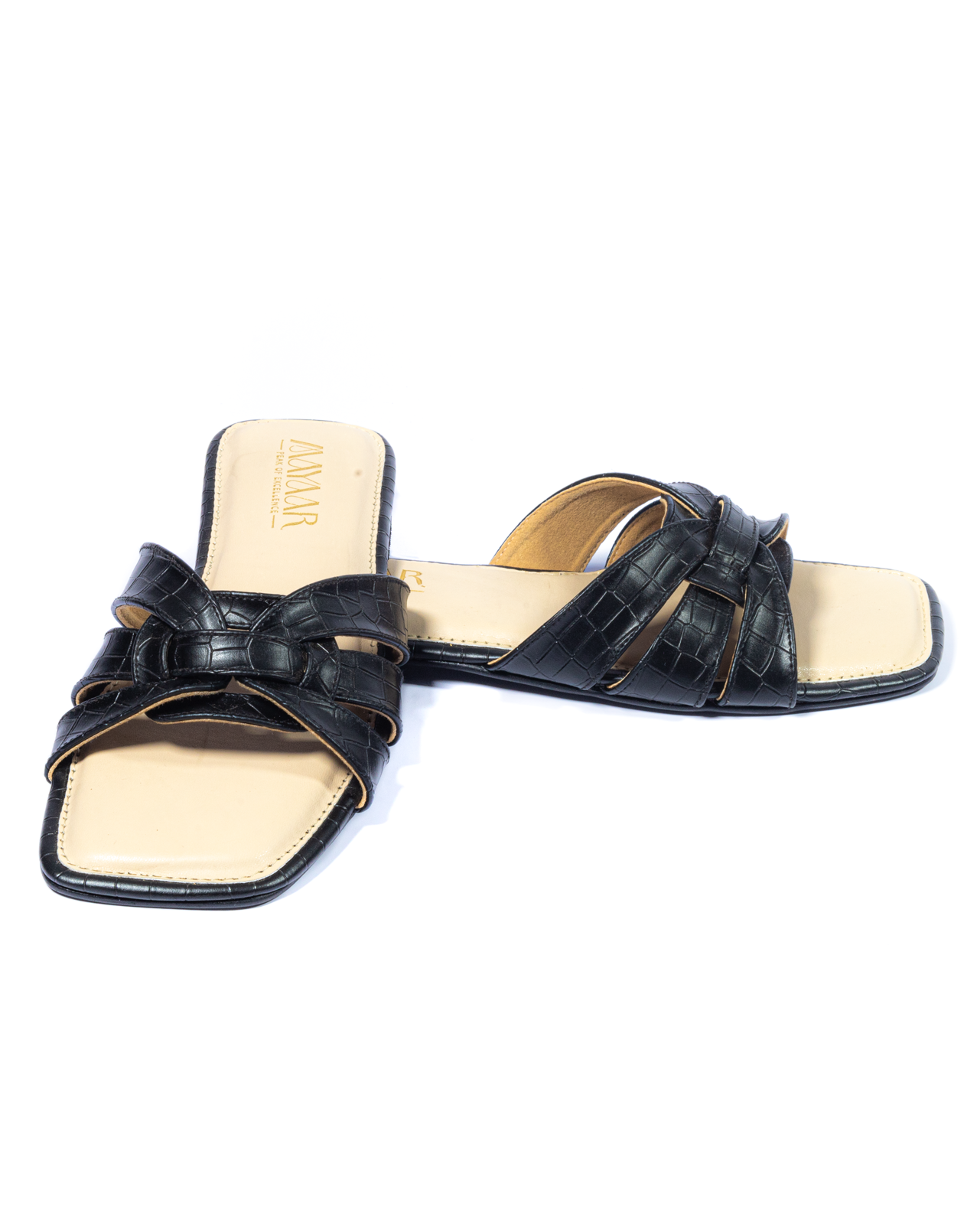 Effortless sophistication meets everyday comfort with our Midnight Luxe Flat Slide Sandals. Featuring a sleek black faux croc-textured upper and intricately woven strap design, these sandals bring a modern twist to classic elegance. The cushioned beige footbed offers all-day ease, while the flat sole makes them perfect for casual outings, workdays, or weekend wear. Pair them with jeans, dresses, or ethnic wear for a refined and versatile look.