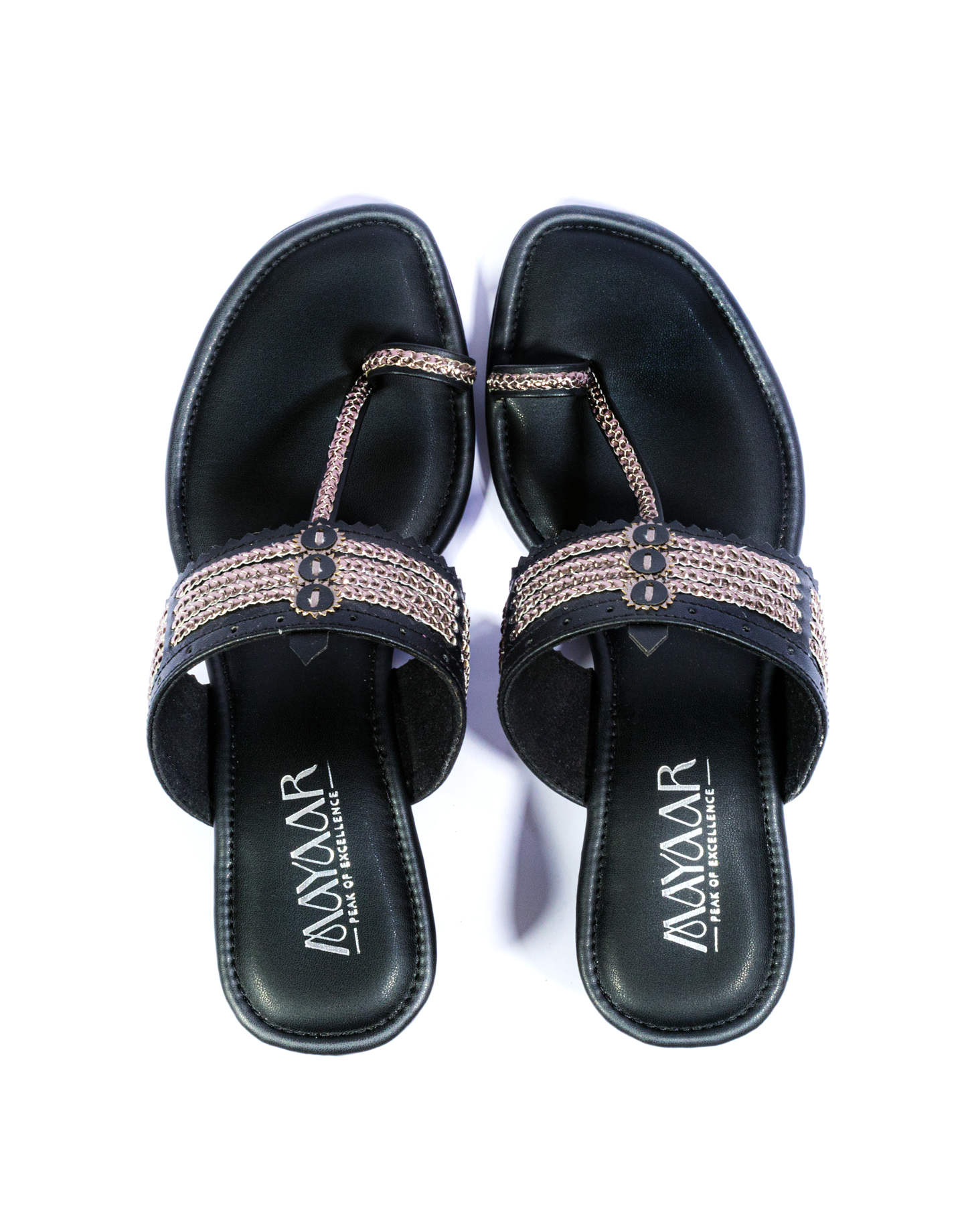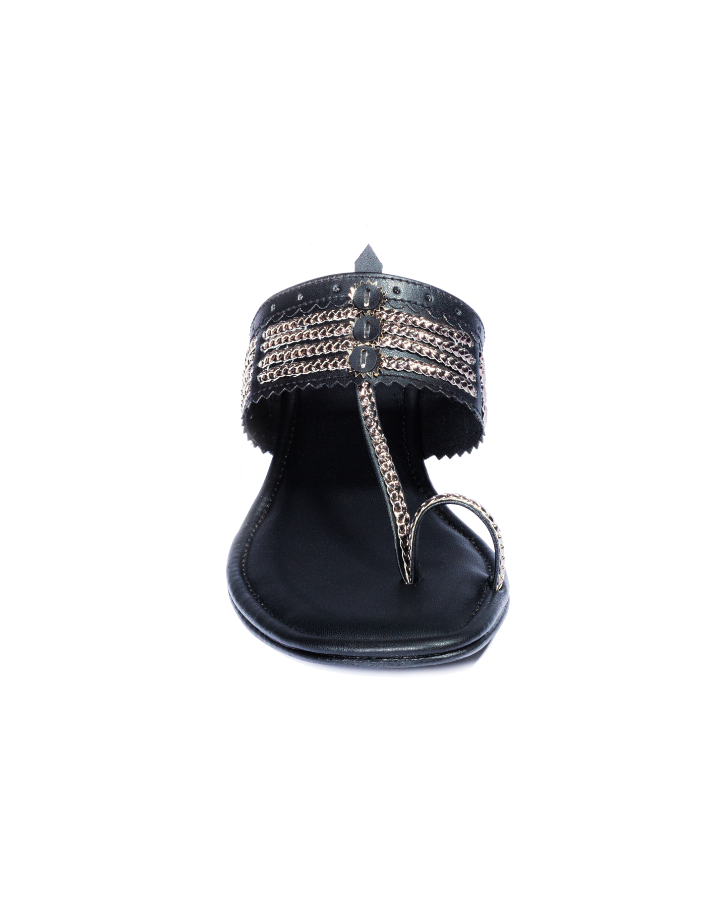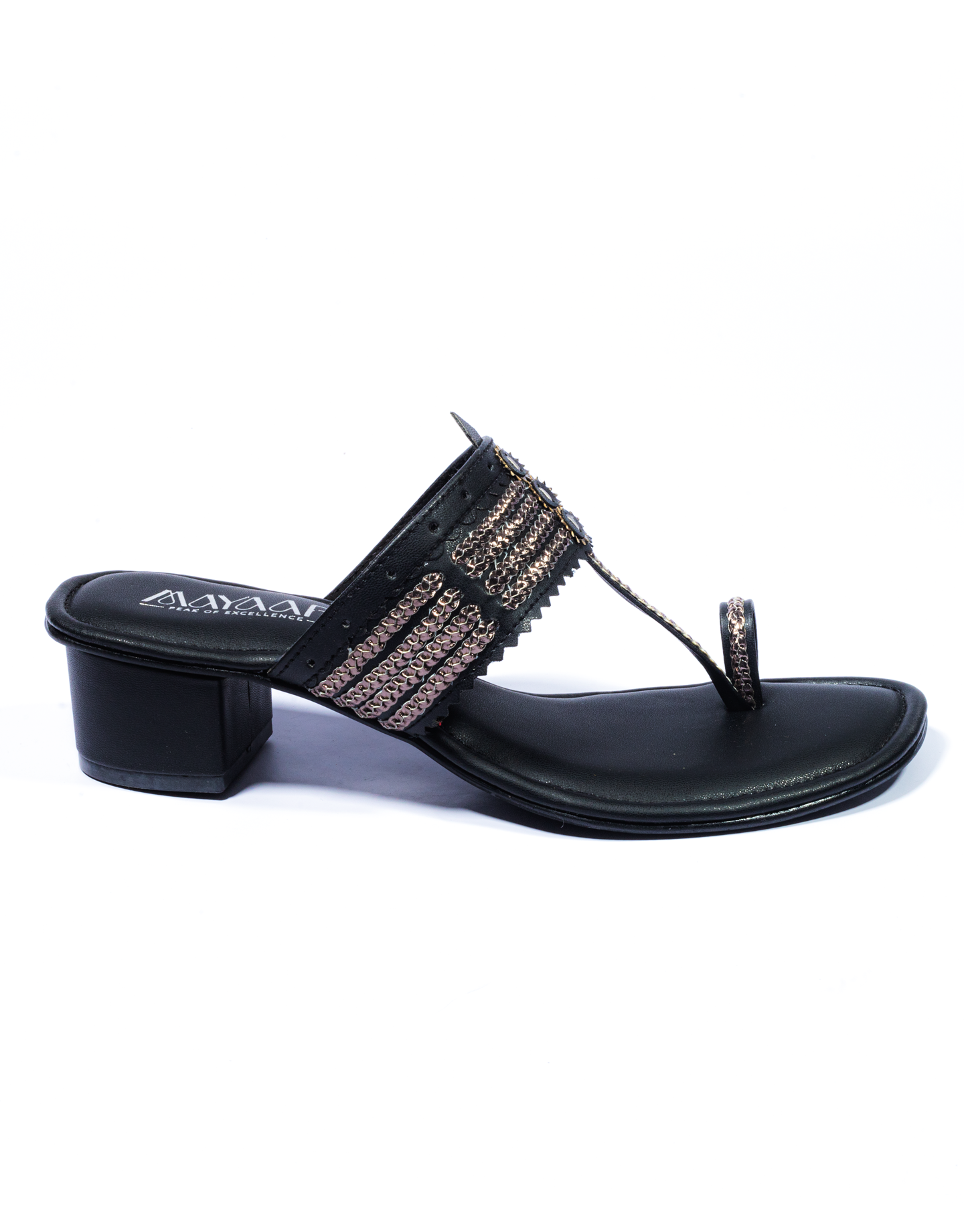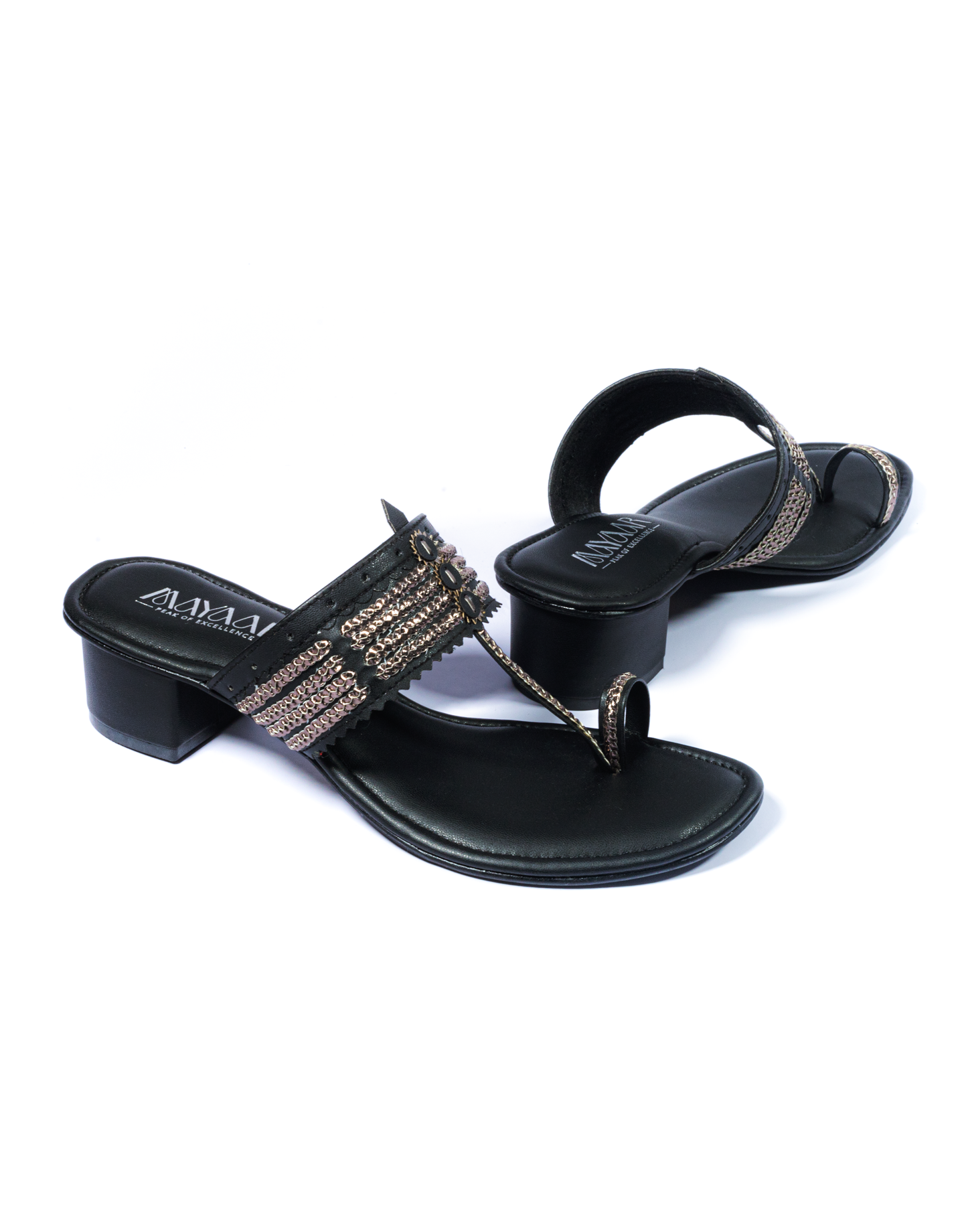 Elevate your ethnic ensemble with the Noir Charm Heeled Kolhapuri, a bold and elegant twist on a classic design. This sandal features a deep black tone with intricate metallic threadwork that adds a touch of shimmer and sophistication. Crafted for comfort, it includes a supportive toe ring and a sturdy low block heel, making it perfect for festive nights, parties, or a chic day out.